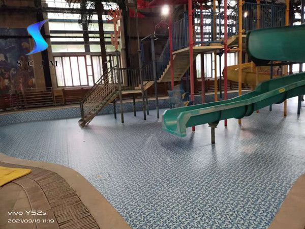 本項目位于北京市,為室內水上樂園項目,原基礎為馬賽克瓷磚,局部有脫落、開裂問題,采用1.5mm泳池膠膜施工安裝,采用滿刮膠工藝熱熔焊接。施工安裝之前瓷磚損壞部分做找平處理,泳池膠膜施工安裝完畢后,整體比較平整、美觀。現場效果如下: